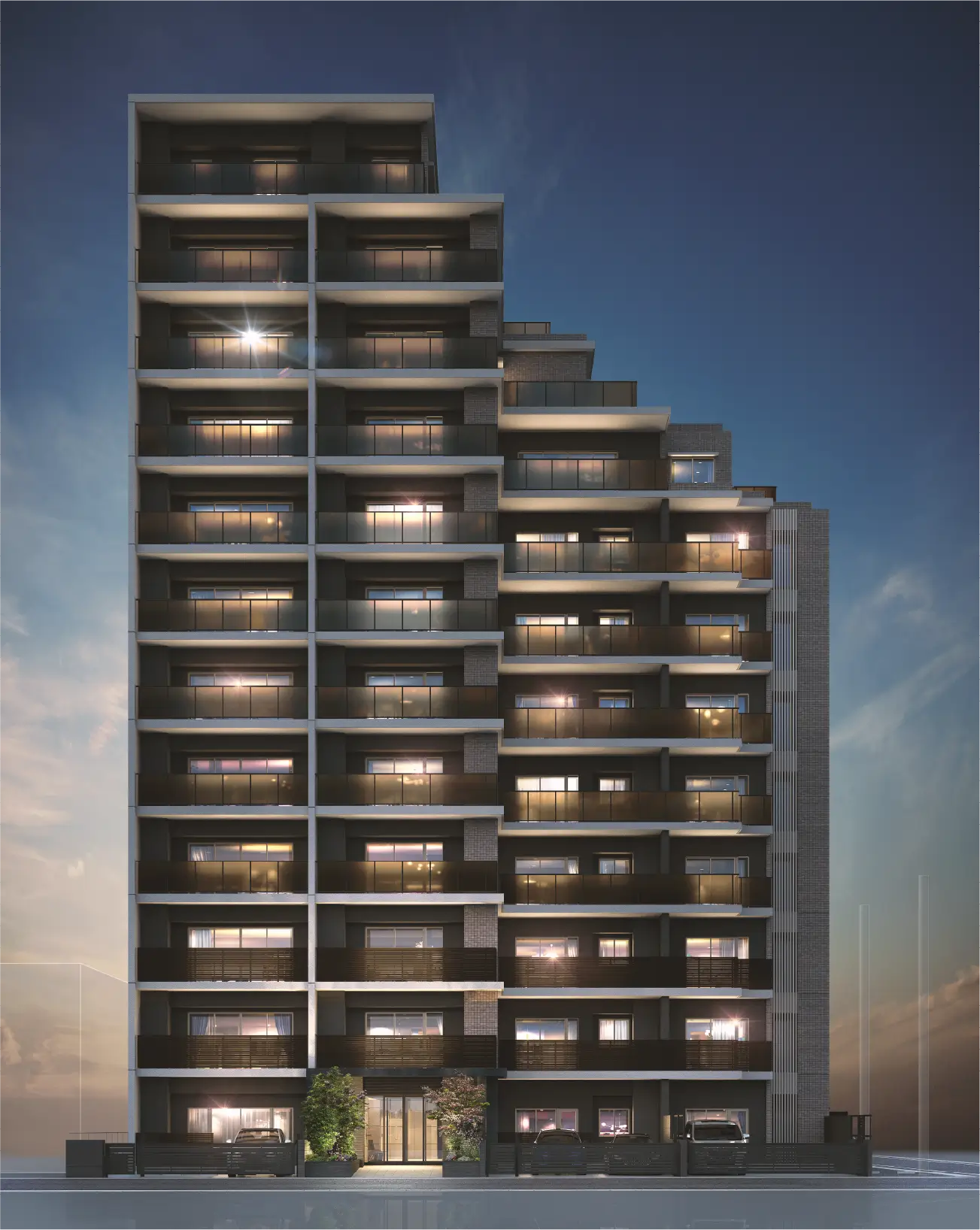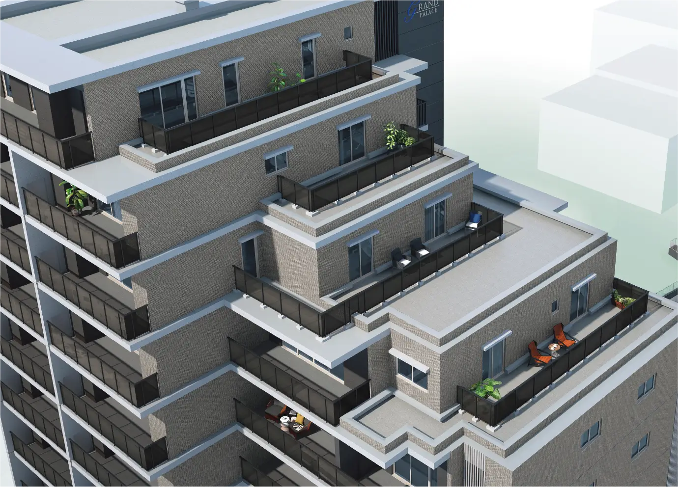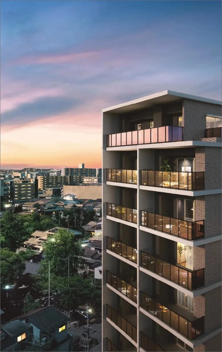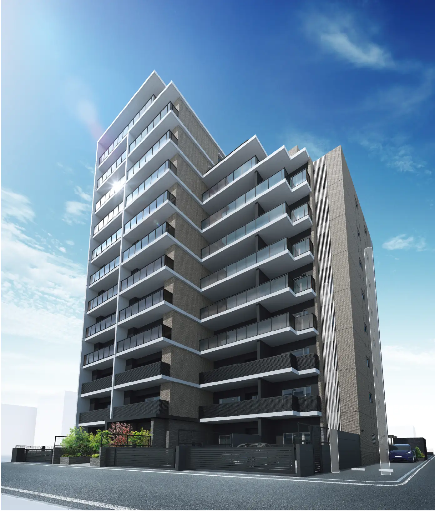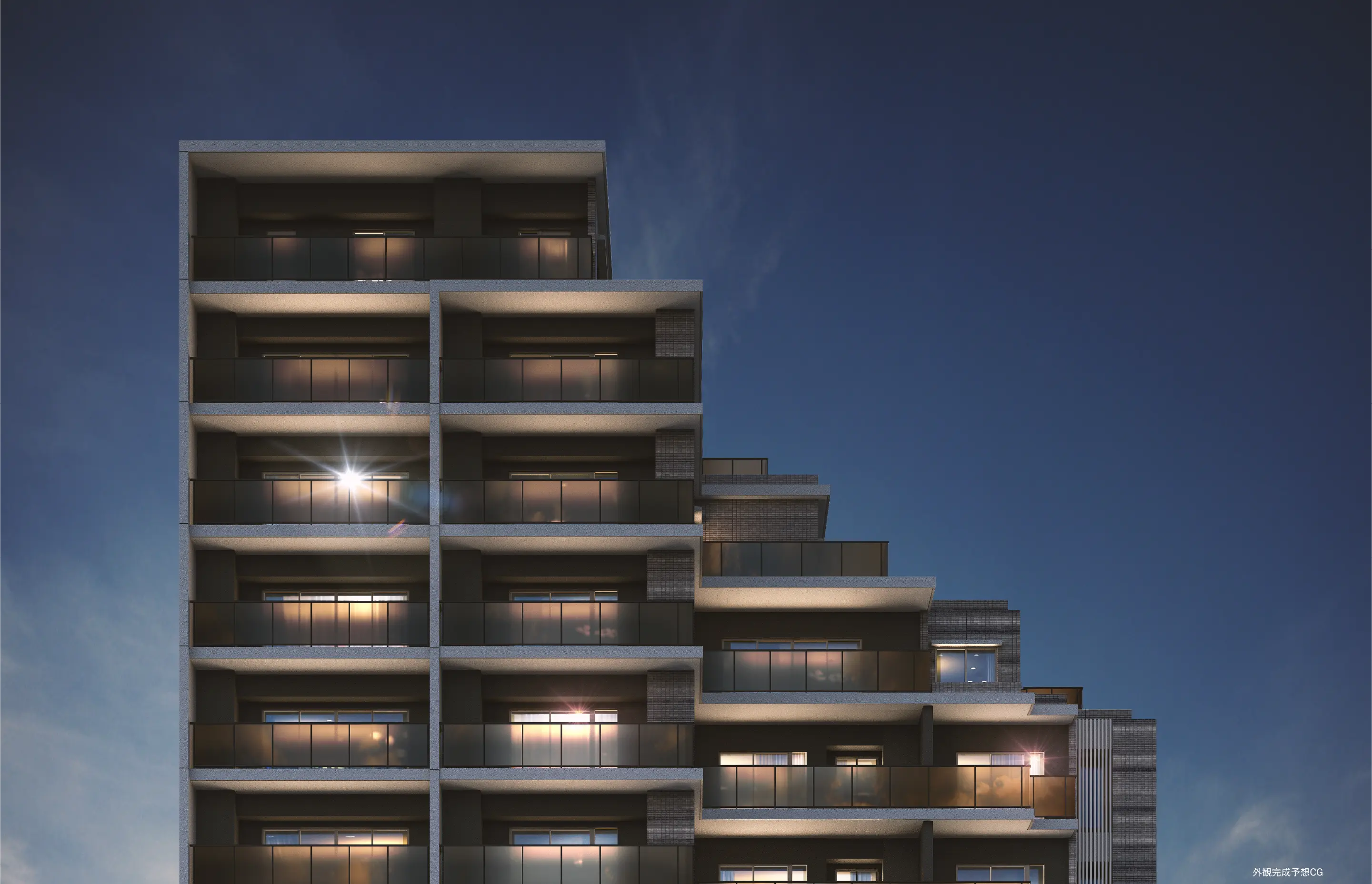 低層階から大空に向かってリズミカルな表情を描く、全邸南東向きの爽快な外観デザインを創造。ガラス手摺や落ち着きのあるアースカラーを基調とした壁面に、床の水平ラインと垂直ラインのマリオンでグリッドを強調し、端正な意匠に仕上げました。周辺の街並みにひときわ映えるモダンで優雅な建築美を追求。住まう誇りを実感していただける格調高いレジデンスです。