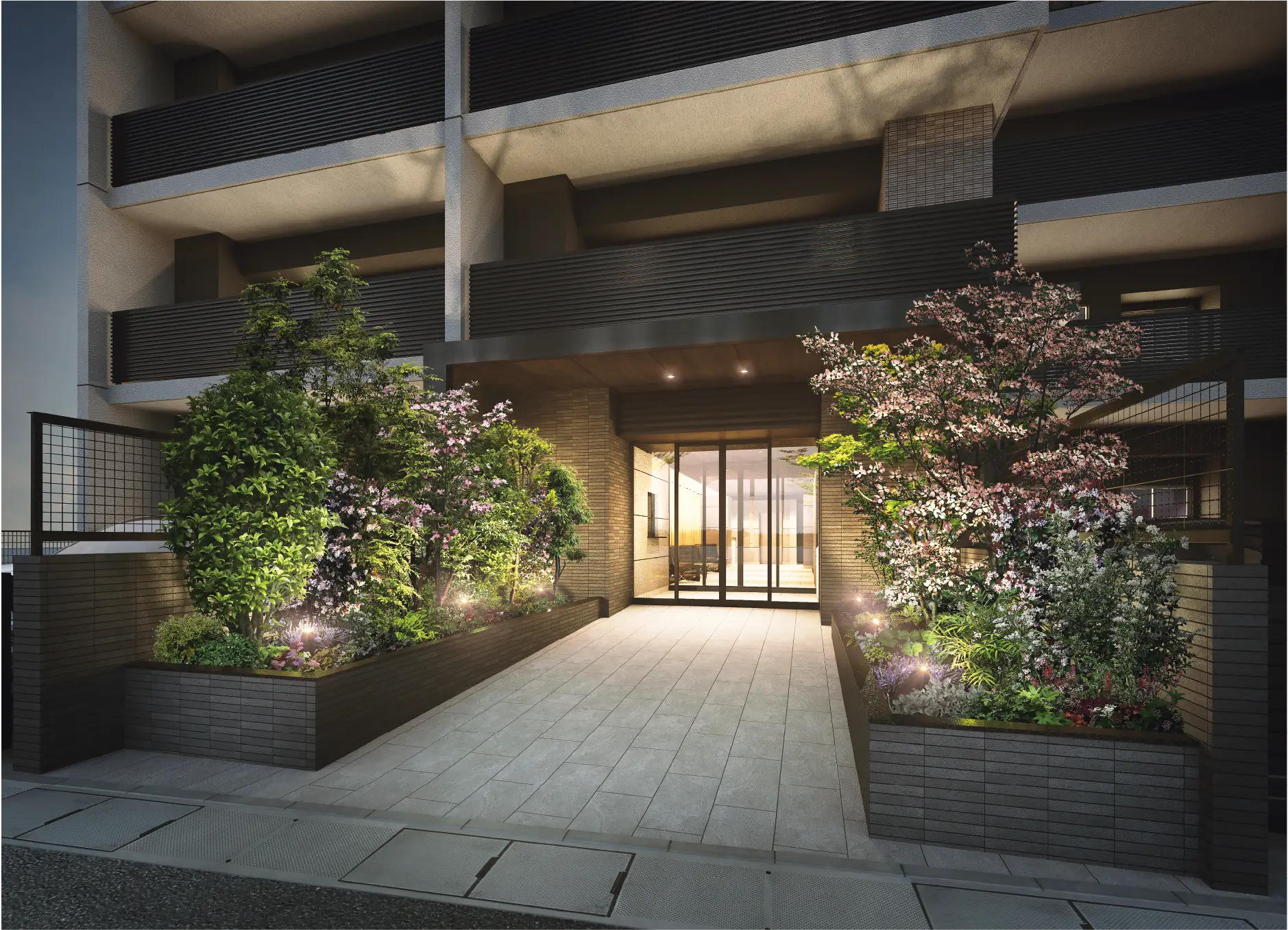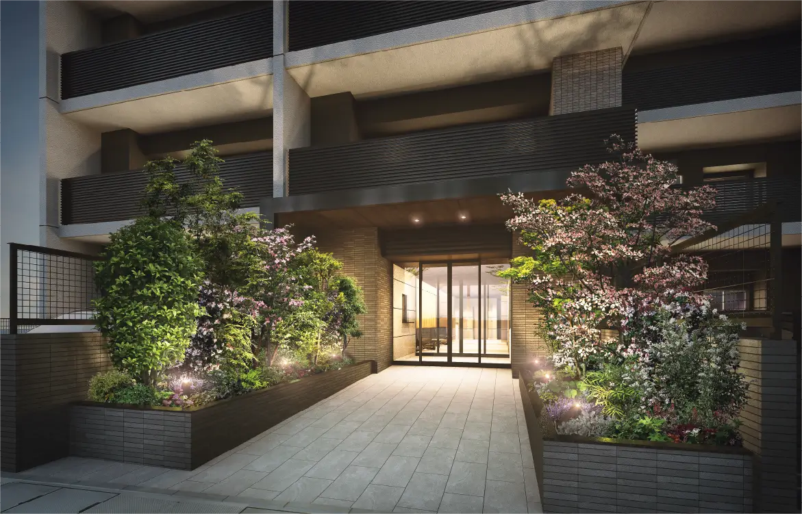 住まう方をあたたかく迎える迎賓のエントランスアプローチ。両脇に配植された鮮やかな緑が四季折々の彩を添えます。
