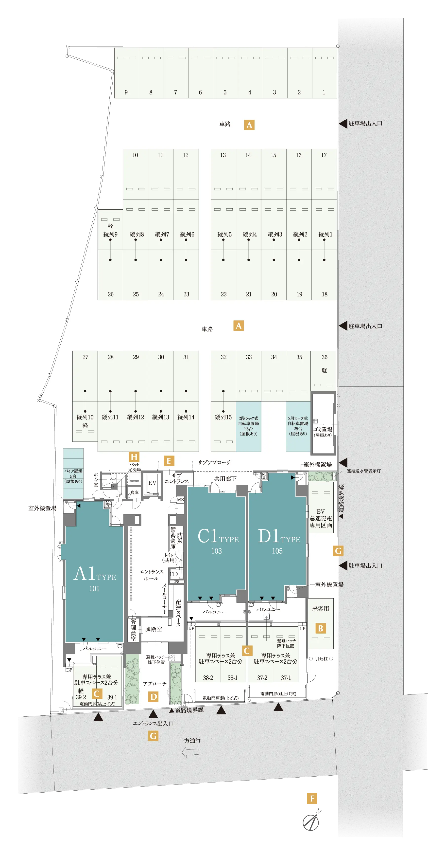 エレベーターの横には駐車場への出入りが可能なサブエントランスを設けています。